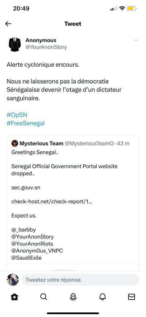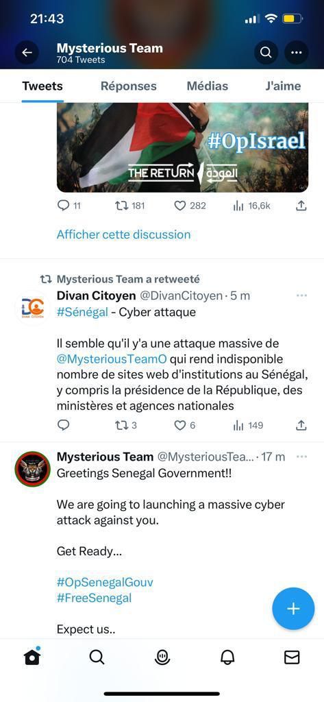 27 mai 2023 à 00:09Le groupe de Hackers @MysteriousTeam annonce avoir procédé à une cyber attaque de plusieurs sites web d'institutions au SénégalPalais présidentiel