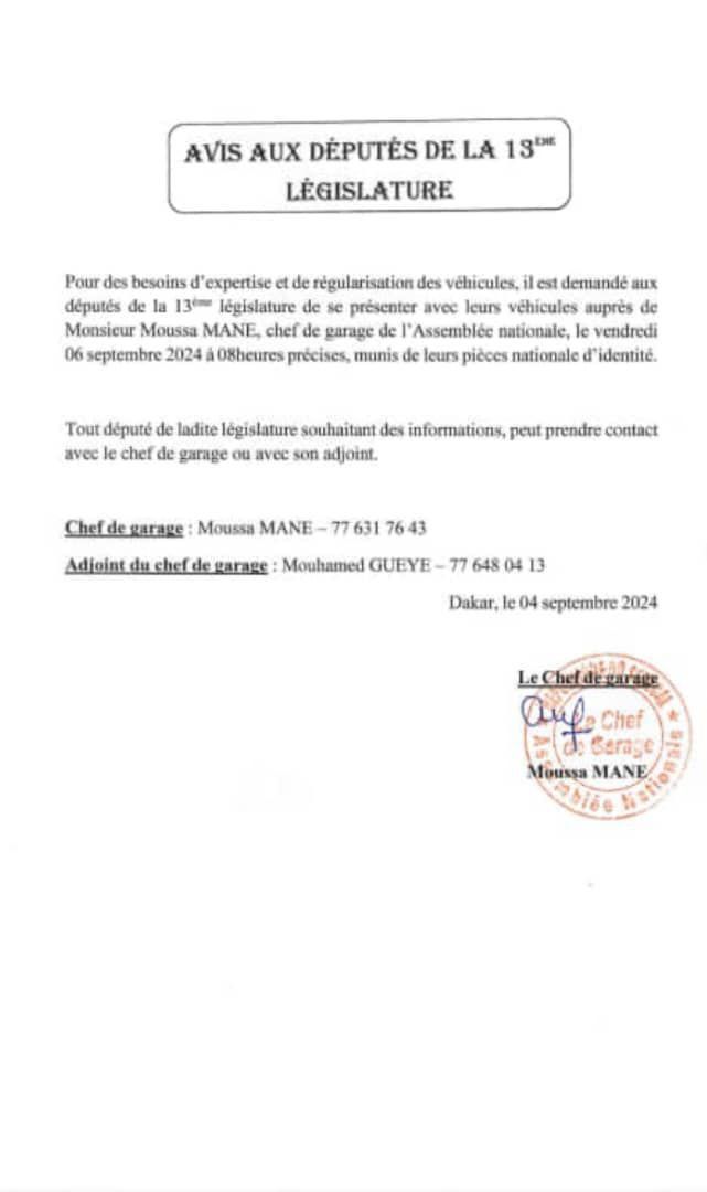 « Pour des besoins d’expertise et de régularisation des véhicules, il est demandé aux députés de la 13 législature de se présenter avec leurs véhicules auprès de Monsieur Moussa MANE, chef de garage de l'Assemblée le vendredi 06 septembre 2024 à 08 heures précises, munis de leurs pièces nationale d’identité. Tout député de ladite législature souhaitant des informations, peut prendre contact avec le chef de garage ou avec son adjoint », lit-on.