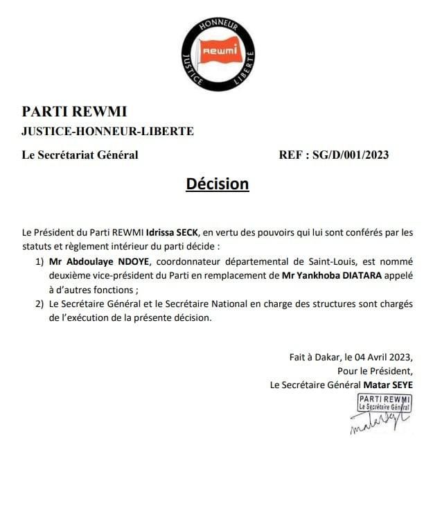 Dans un communiqué de presse, il est mentionné que le Président du Parti Rewmi, Idrissa Seck, en vertu des pouvoirs qui lui sont conférés par les statuts et règlement intérieur, a décidé que Abdoulaye Ndoye, coordonnateur départemental de Saint-Louis, est nommé deuxième vice-président du Parti en remplacement de Mr Yankhoba Diatara appelé à d'autres fonctions.