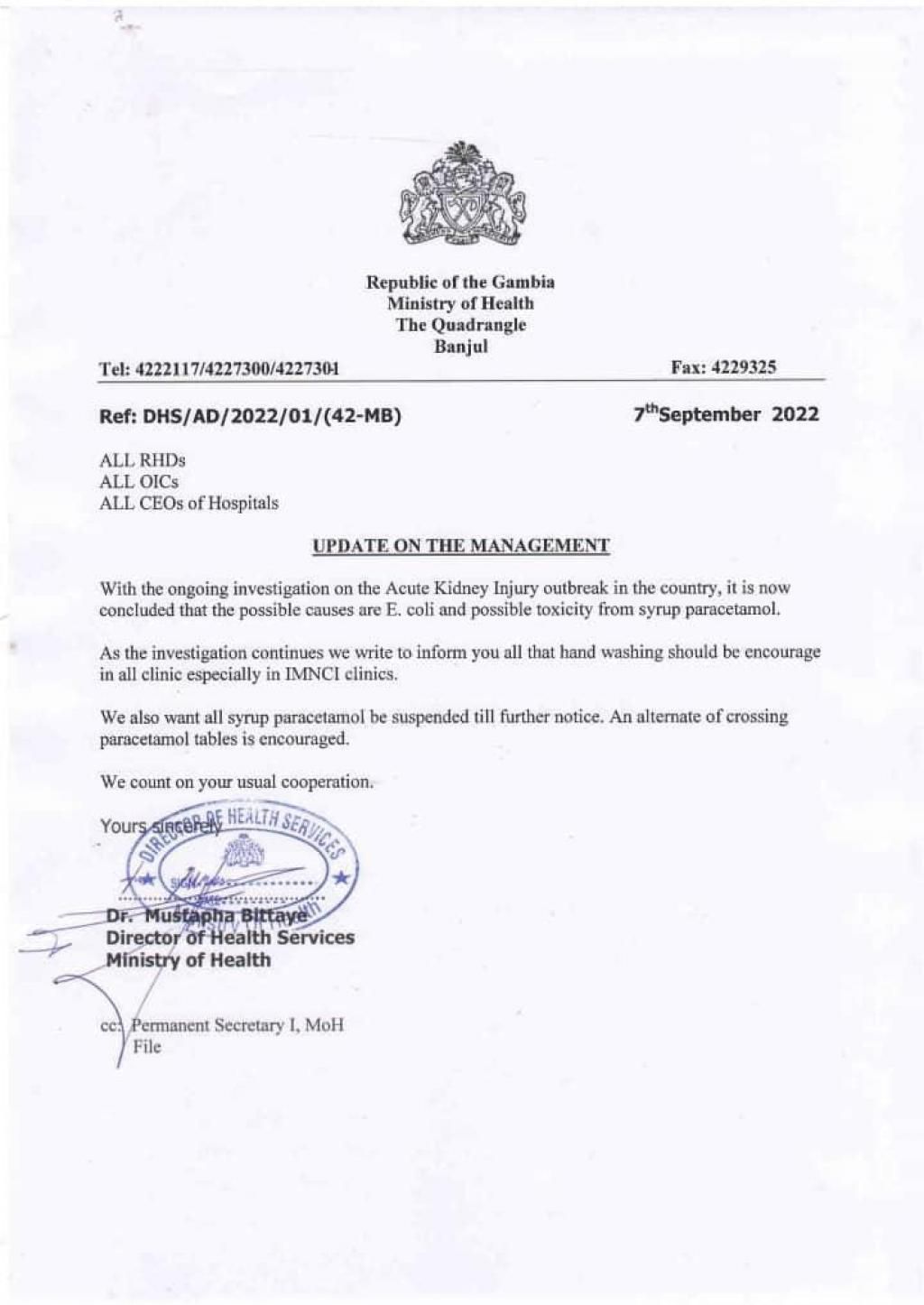 "Des dizaines d’enfants sont morts au cours des trois derniers mois, a expliqué M. Bittaye cité par l’agence. Les autopsies ont permis de supposer une éventuelle [action léthale] du paracétamol." En août, le ministère gambien de la Santé a rapporté 28 morts qui pourraient être liées à l’utilisation d'un sirop contenant du paracétamol.