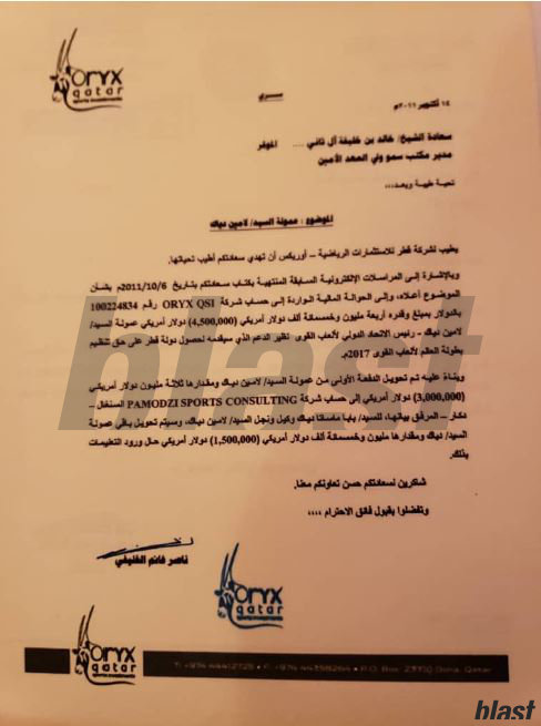 Le courrier indique également que la commission «a été transférée sur le compte en dollars de la société Oryx QSI numéro 100224834, domicilié à la Qatar National Bank. »
