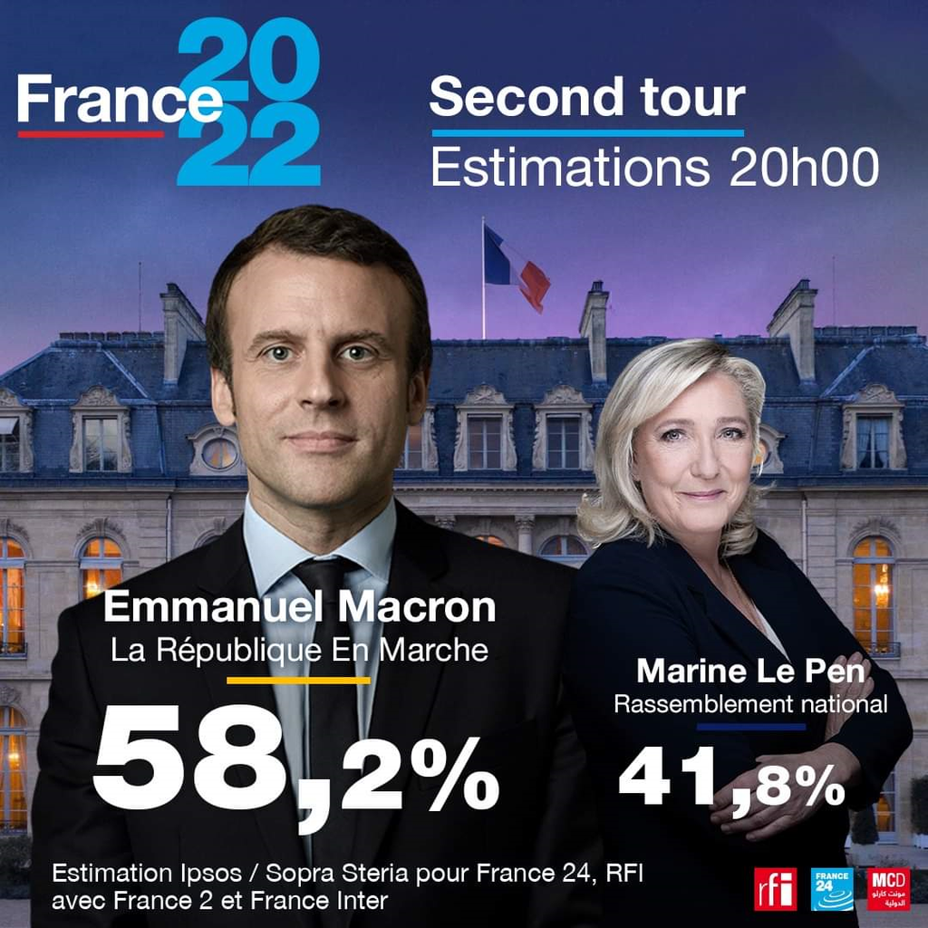 Emmanuel Macron a été réélu dimanche à la présidence de la République avec 57,6 à 58,5% des voix face à Marine Le Pen (41,5-42,4%) selon les premières estimations, une nette victoire tempérée par l’écart notablement serré avec l’extrême droite et une abstention élevée (28%).