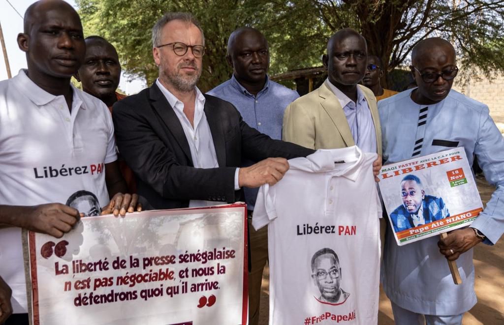 Ibrahima Lissa Faye (gauche), aux côtés du secrétaire général de RSF, Christophe Deloire (milieu), participe à une manifestation pour la libération du journaliste sénégalais Pape Alé Niang