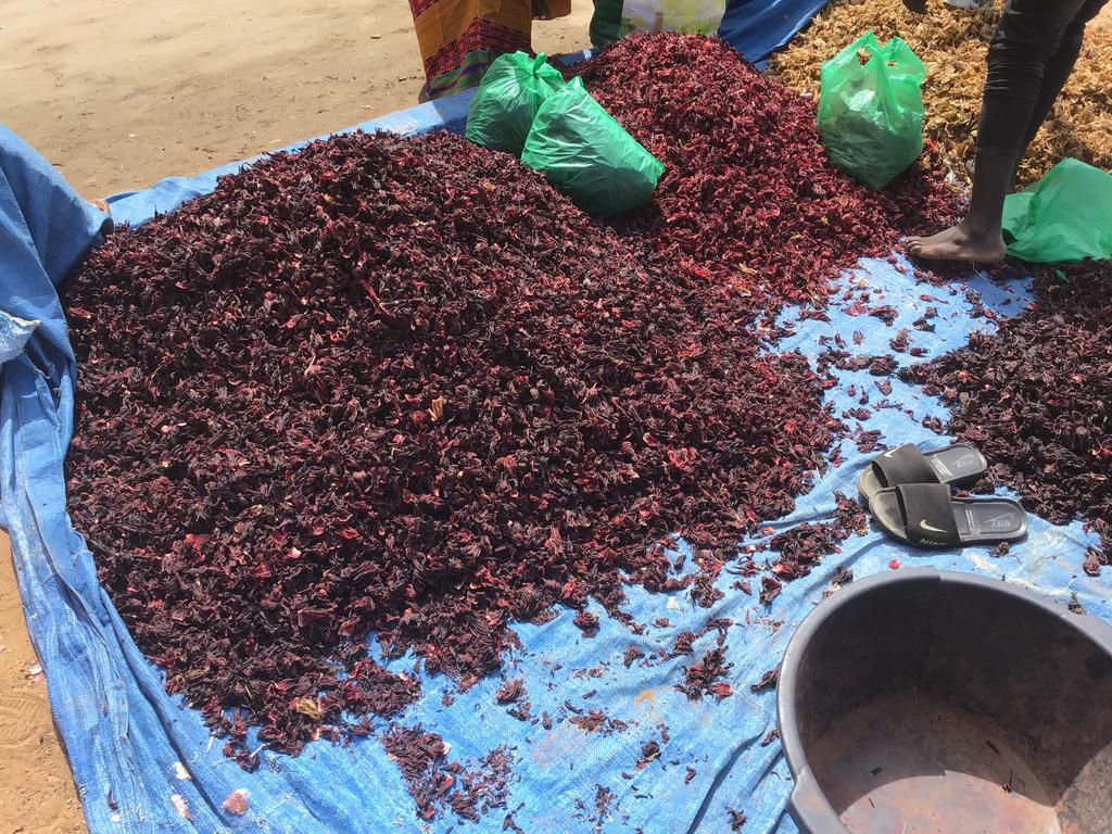 Un ciel qui s’assombrit à l’image d’un environnement hivernal, des allers et retours entre les différents coins et recoins animent le marché de Dior. En ce premier vendredi du mois béni du ramadan, le commerce de denrées de premières nécessités est l’activité charnière. Sur un espace bien aménagé à proximité du terrain Acapes, Abdou, vêtu d’un t-shirt bleu et d’un pantalon noir étale sur un sac de riz différents types de bissap (fleurs d'hibiscus). Pieds-nus, le jeune originaire du Baol (centre du Sénégal) échange avec ses clients. July, âgée d’une cinquante d’année, est venue chercher sa commande de bissap et d’arachides. Elle ne semble pas être satisfaite, car « l’arachide n’est pas encore acheminée sur place ».