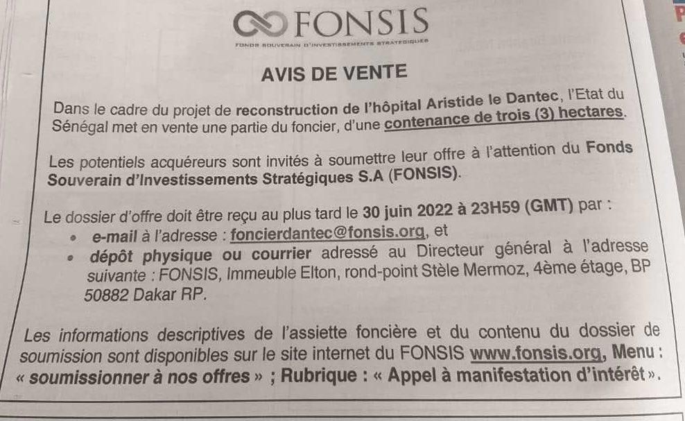 Le Président Macky Sall avait annoncé le début de la reconstruction de l’hôpital Aristide Le Dantec sur son site actuel et la vente de 3 ha aux Indiens pour une valeur de 150 milliards, en vue d’y ériger des immeubles de grands standings.