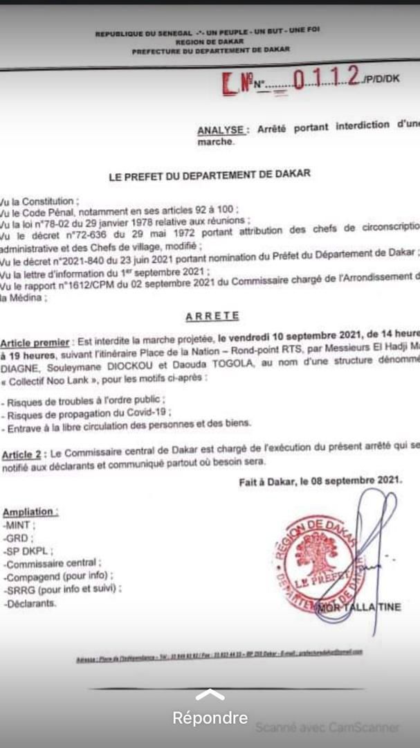 Le préfet de Dakar a signé l'arrêté d'interdiction. « Noo Lank » voulait protester contre la cherté de la vie avec l’augmentation des prix des denrées de première nécessité. Pour rappel, une autre manifestation contre la vie chère est aussi prévue ce dimanche 12 septembre, de 9h à 14h, du Lycée Seydina Limamoulaye à la préfecture de Guédiawaye.