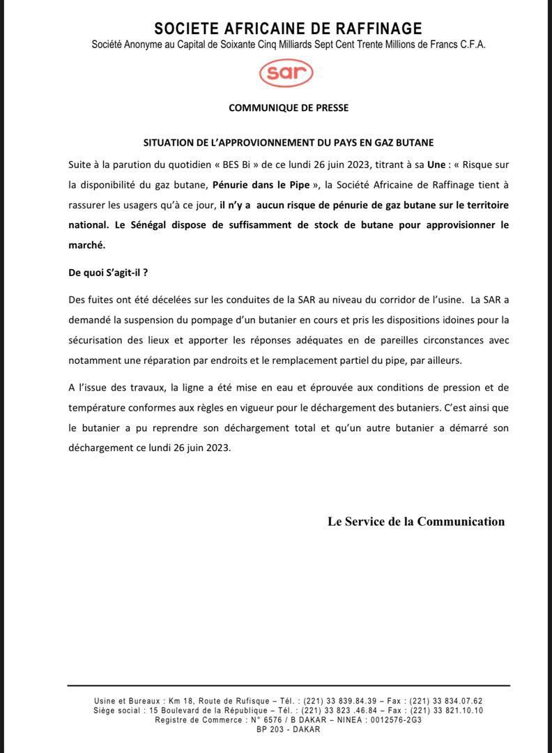 Dans un communiqué, la Société Africaine de Raffinage a d'abord tenu à écarter tout risque de pénurie de gaz Butane en déclarant que le Sénégal dispose de suffisamment de stock de butane pour approvisionner le marché.