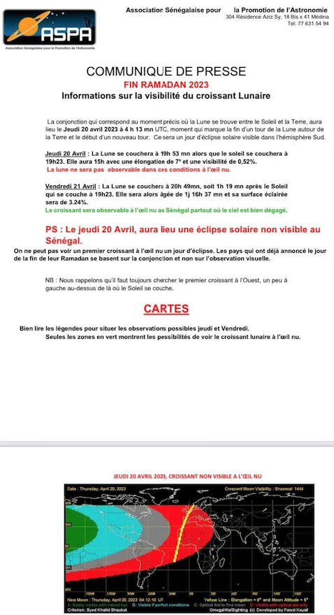 « On ne peut pas voir un premier croissant à l’œil nu un jour d’éclipse. Les pays qui ont déjà annoncé le jour de la fin du ramadan se basent sur la conjonction et non sur l’observation visuelle » a indiqué l’Aspa. L’association précise que la surface de la lune sera éclairée de 3.24% le vendredi 21 avril. La lune se couchera à 19 h 49mn, soit 1 h 19 mn après le soleil.