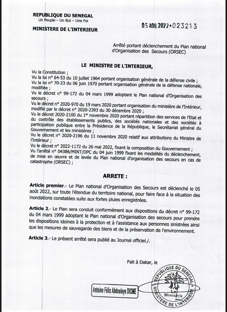 05 août 2022 à 19:00Suite aux fortes pluies enregistrées ce vendredi 5 aout 2022, avec plus de 126mm à Dakar, le Plan national d'organisation des secours (ORSEC) a été déclenché sur instruction du Chef de l'État, Macky Sall.Inondations à Keur-Massar en 2021