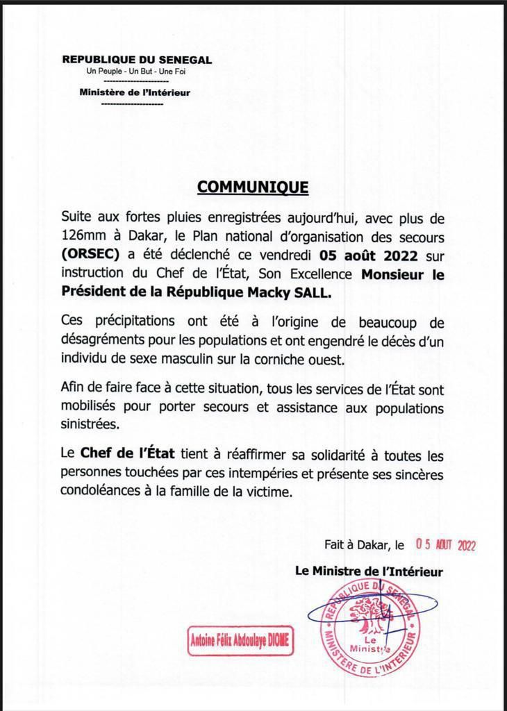 Le ministère sénégalais de l'Intérieur a indiqué, dans un communiqué, que le plan ORSEC avait été déclenché sur instruction du président sénégalais Macky Sall.