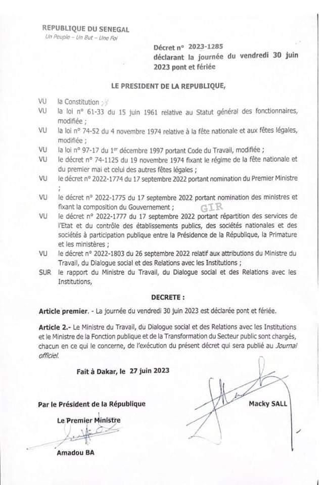 Par un décret, le président de la République a déclaré la journée du vendredi 30 juin 2023 férié. Ceci pour permettre aux travailleurs de profiter du long week-end et de passer une bonne fête de Tabaski en famille.