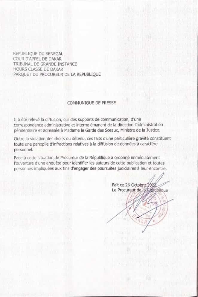 Le procureur de la République a ordonné “immédiatement l'ouverture d'une enquête pour identifier les auteurs “ de la diffusion "d'une correspondance administrative interne émanant de la direction l'administration pénitentiaire et adressée à Madame le Garde des Sceaux, Ministre de la Justice