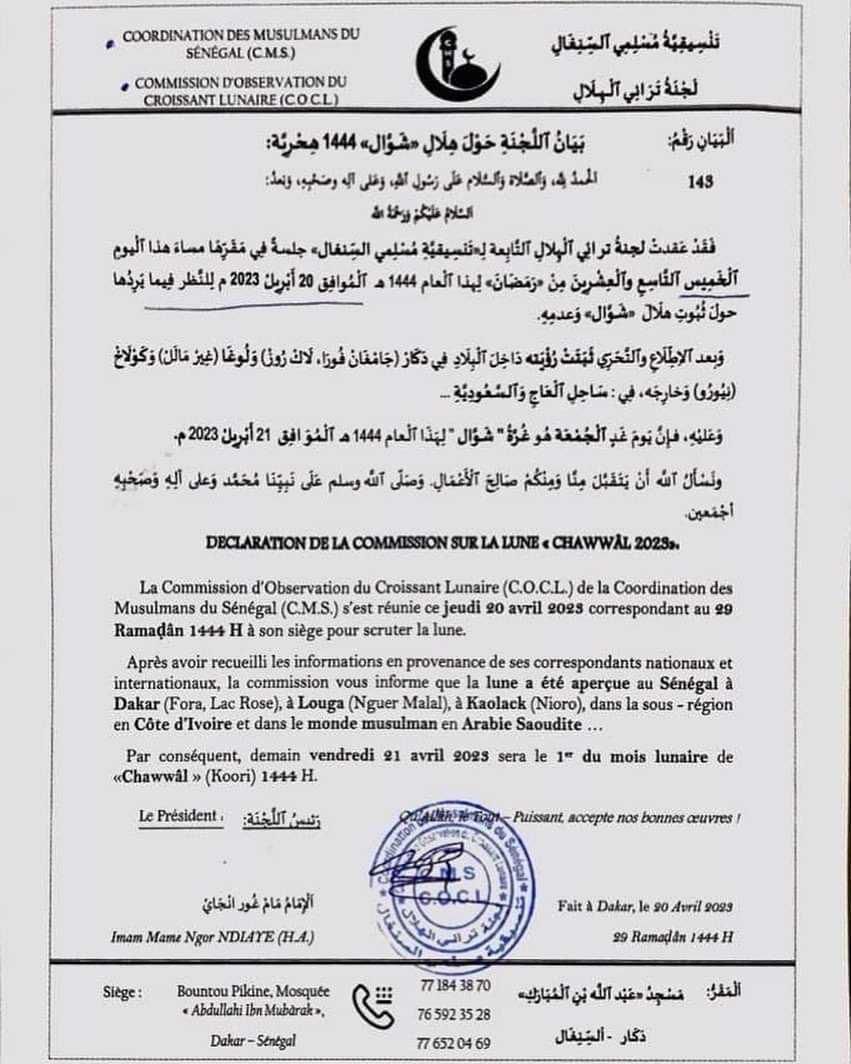 La Coordination des Musulmans du Sénégal (CMS) déclare la fin du ramadan ce jeudi 20 avril 2023.
