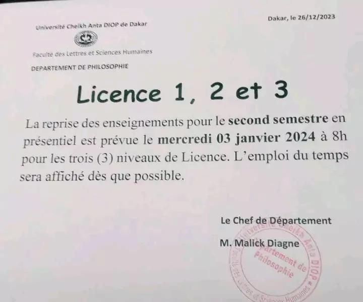 Les cours en présentiel vont reprendre à la Faculté des lettres et sciences humaines de l’université Cheikh Anta Diop de Dakar (UCAD). En effet, les cours du second semestre de l’année universitaire 2022-2023 iront du 03 au 31 janvier 2024. L’amicale de la Faculté des Lettres et Sciences Humaines de l’Ucad s’inquiète de la conséquence de cette reprise sans la réouverture du campus social.