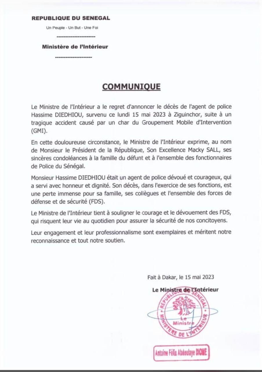 15 mai 2023 à 16:59Un policier répondant au nom de Hassime Diédhiou a perdu la vie dans une manoeuvre accidentelle d'un véhicule du Groupeent Mobile d'Intrvention (GMI), ce lundi 15 mai 2023, lors des heurts entre FDS et militants de Ousmane Sonko Ziguinchor.Hassime Diédhiou policier tué à Ziguinchor