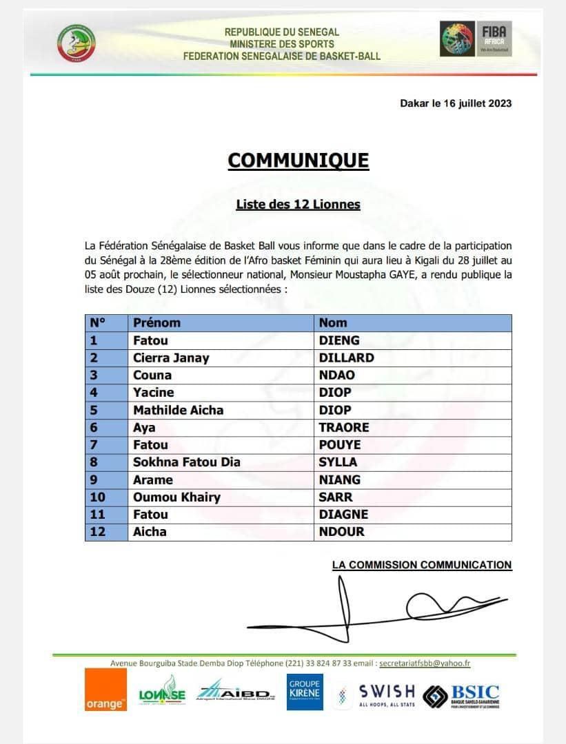 Le sélectionneur national, Moustapha Gaye, a rendu publique la liste des 12 Lionnes du Sénégal retenues pour l'Afrobasket 2023 (28 juillet-05 août, Rwanda). Léna Timéra, pensionnaire du club français Cavigal Nice Basket 06, et Oumou Kalsoum Touré, joueuse de Voironnais Basket Club (France) ont été écartées par le coach.