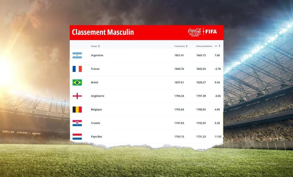Battu par l’Allemagne (1-2) en amical, la France a perdu des points dans ce nouveau pointage de l’instance faîtière du football mondial. Les Bleus restent tout de même à la deuxième position sur le podium, devant le Brésil (3e), l’Angleterre (4e) et la Belgique (5e) qui complète le top 5.