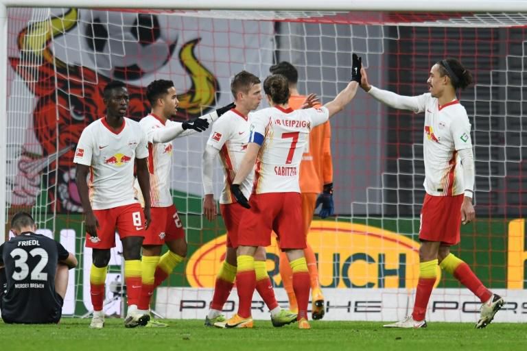 Dani Olmo (C) celebrates scoring RB Leipzig's second goal at home to Bremen on Saturday