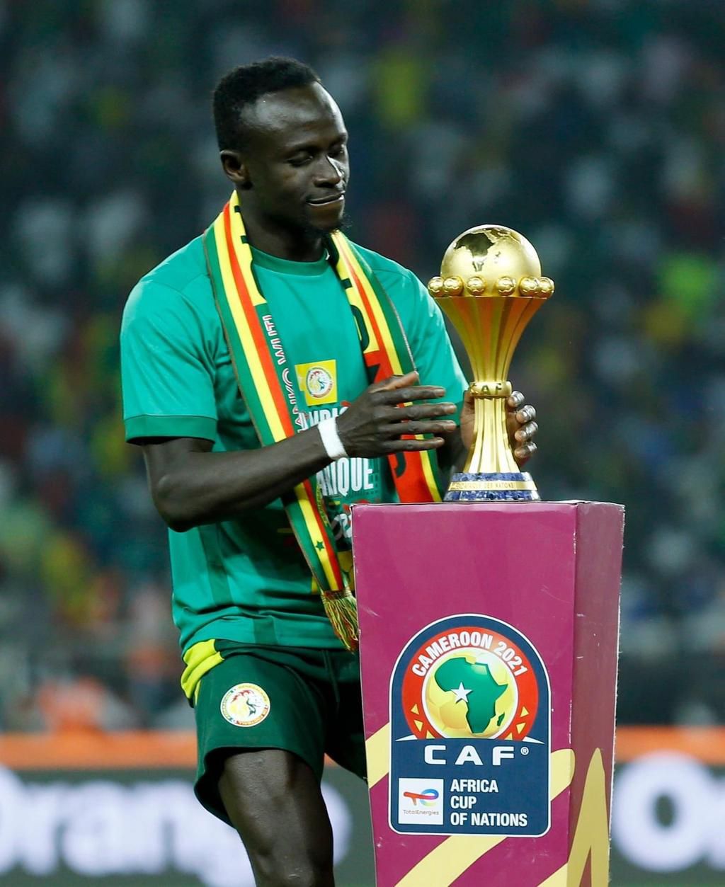 Sadio Mané touchant le trophée de la CAN après la finale contre l'Egypte