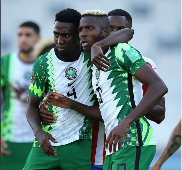 Victor Osimhen celebrates his opener with Wilfred Ndidi in Tangier, Morocco.