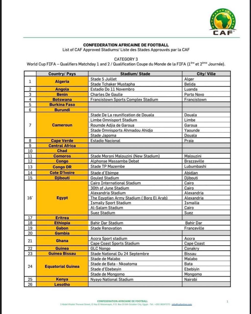Parmi les 56 pays membres, 21 ont été recalés et ne comptent pas le moindre stade aux normes sur leur territoire. En attendant que des travaux soient menés, ces nations seront contraintes de trouver une solution pour jouer leurs matchs «à domicile» dans un autre pays. C’est notamment le cas du Sénégal, du Mali, du Burkina Faso, du Burundi, de la Gambie, de la Centrafrique, du Tchad, du Liberia, du Niger, et de la Sierra Leone.
